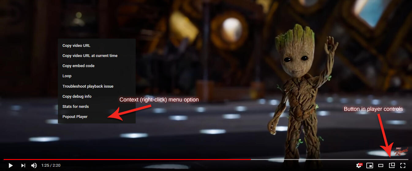 Open links to YouTube videos and/or playlists from any website in the popout player with a convenient right-click option.